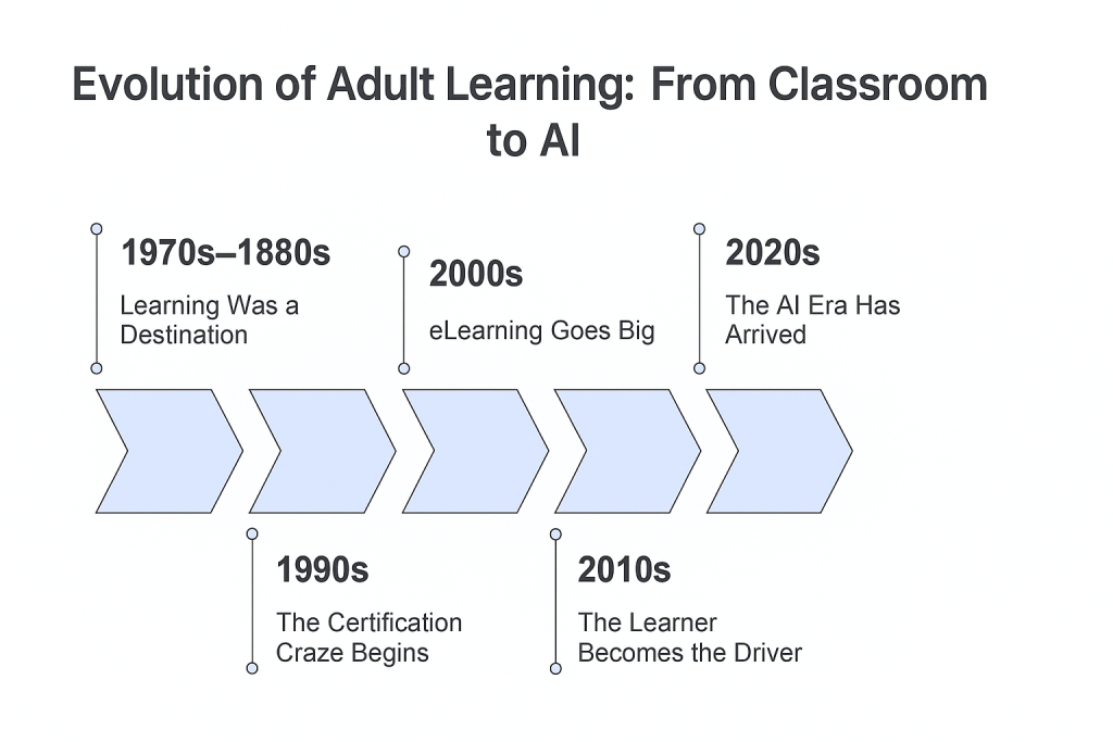 The way adults learn has been flipped on its head over the past five decades. What once involved overhead projectors and printed manuals is now powered by AI tutors, code simulators, and personalized learning bots. In a world of constant disruption, continuous learning isn’t a luxury anymore — it’s survival.
